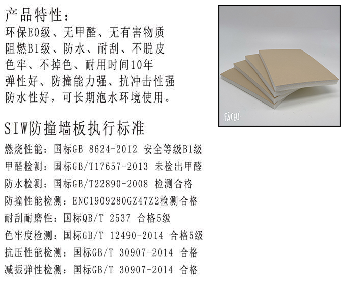 環保性:防撞軟包是環保產品,材料無毒,不會產生和揮發有害物質,對人體無傷害。經國家建筑材料測試中心檢測,該產品符合國家強制性標準GB18580-2001規定的E1級。既屬于可以在室內使用的裝飾材料。