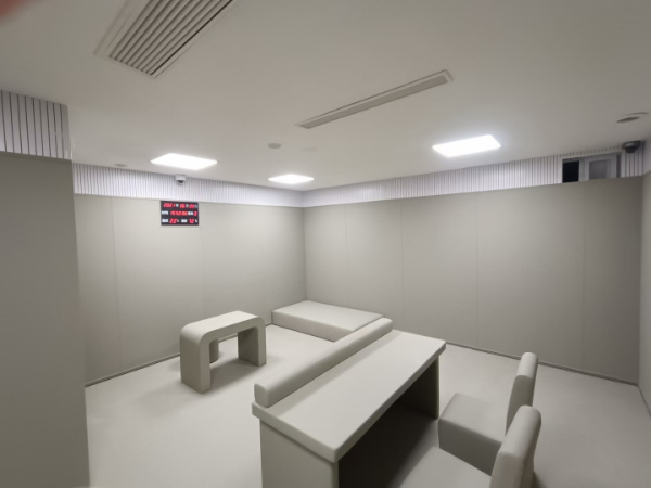 4、審問室防撞軟包音質佳:審問室防撞軟包不光能降噪音,并且能使混響時間達到聲學設計標準,使環境音質愈加飽滿、明晰、富立體感。由設計師憑想象力做一些特殊的造型來添加作用,對混響起到很好的調節作用。