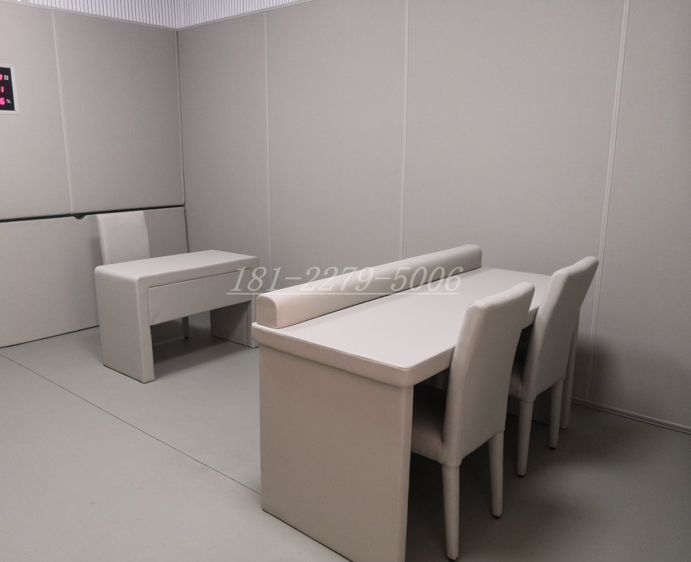 談話室防撞墻辦案區防撞墻面軟包建設標準包括很多方面,墻面板材防撞要撞不到底,回彈性高,并有設計卡扣修邊條,分為公母卡扣型:底座與壓邊條。安裝完成后不留一絲縫隙給室內對象進行破壞或防止其故意傷害自身的行為。另外室內裝修應有吸聲功能,材料均具備吸聲及隔音處理,以凈化音質,達到錄音清晰的目的。談話室以外的過道或醫療室也要在墻面做防撞軟包處理。辦案區談話室室地面也要求做塑膠地板。